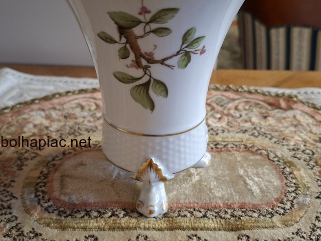 Hollóházi kézzel festett madaras porcelán váza – háromlábas, aranyozott