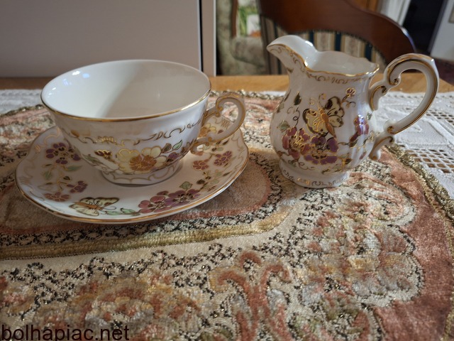 Eladó eredeti Zsolnay porcelán kínáló készlet, kézzel festett virágos–pillangós dekorral, arany szegéllyel.